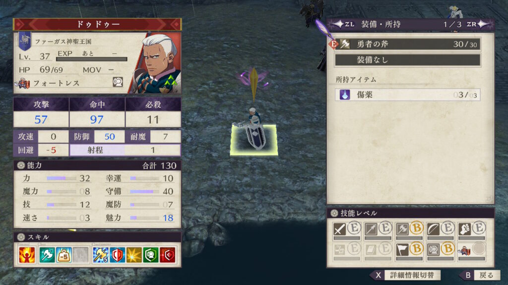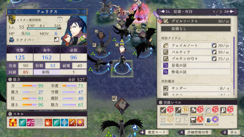 | ラディスラヴァ (飛行) | 防御33 耐魔12 (飛行特効無効) | 敵将ではあるが将星に留まるので、状態異常が有効。アウロラの盾を盗めば飛行特効が狙える。 金鹿の学級編とは違いフェイルノートがこの時点ではまだ手に入らないので、パルティア+強弓を使えるフェリクスを起用。 要求ダメージが194なので、無惨では盾を盗んで有効を入れても到達できない。 |