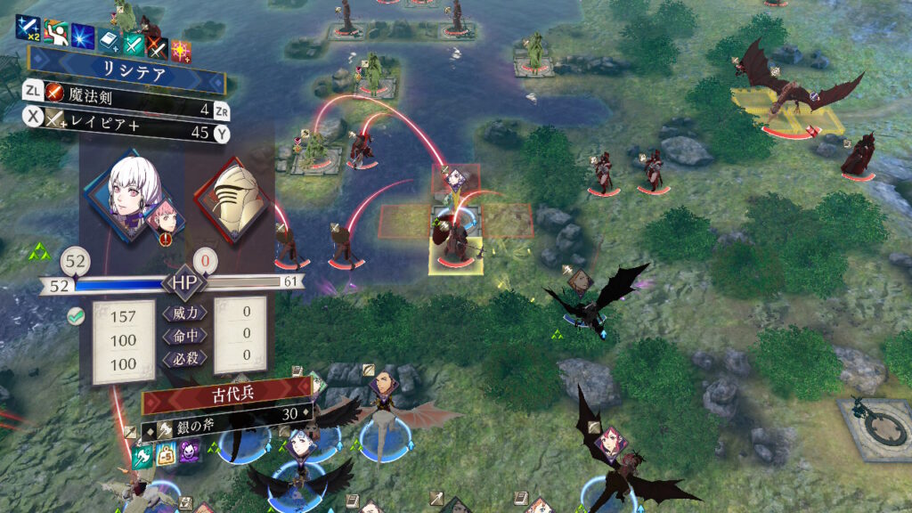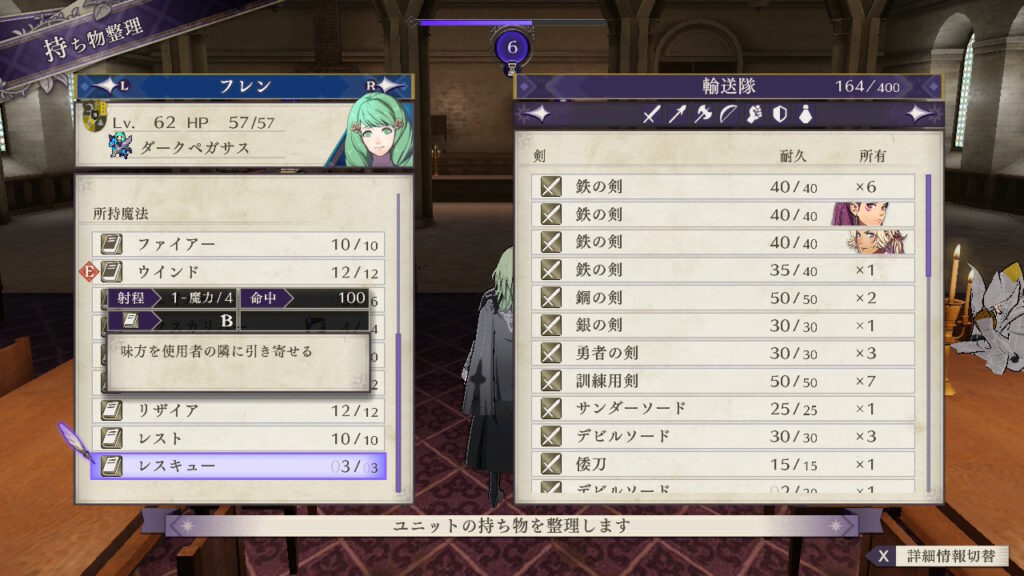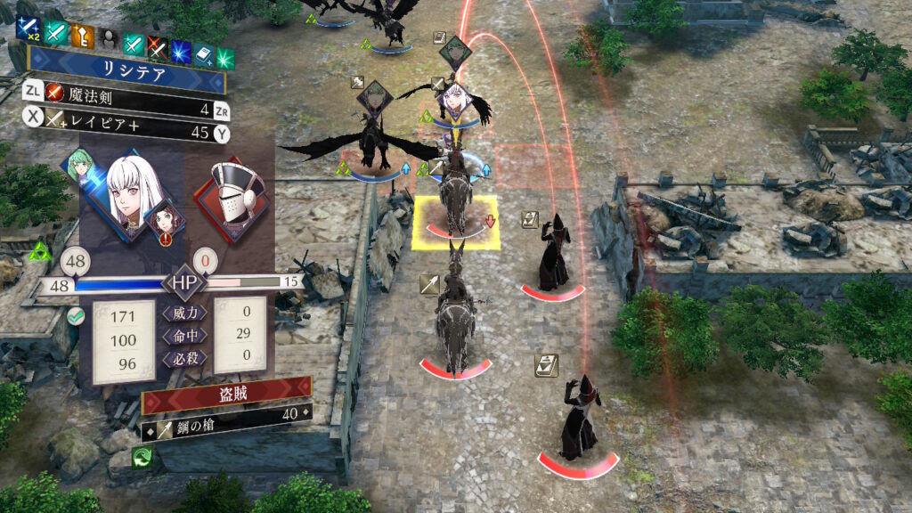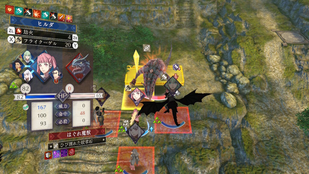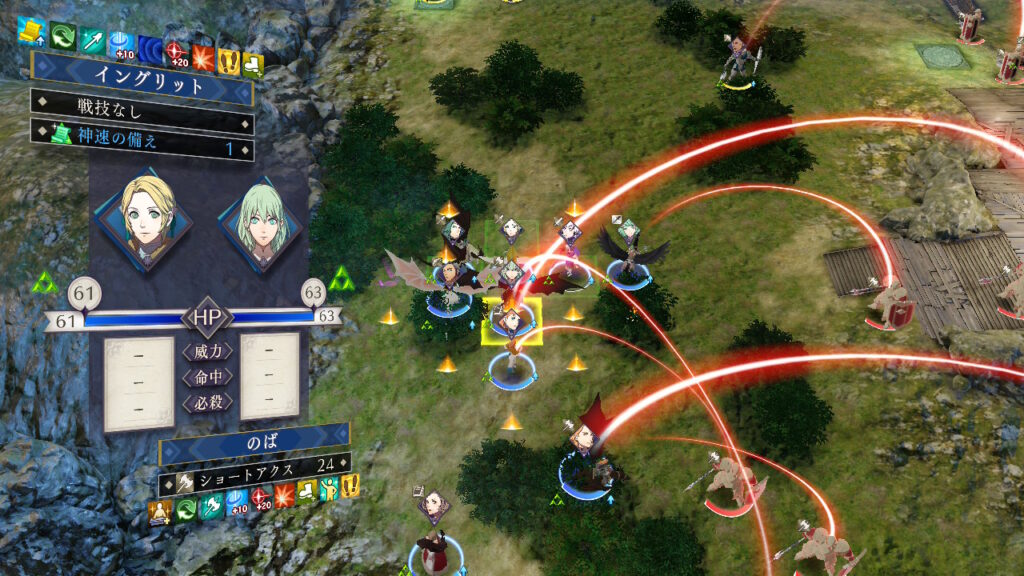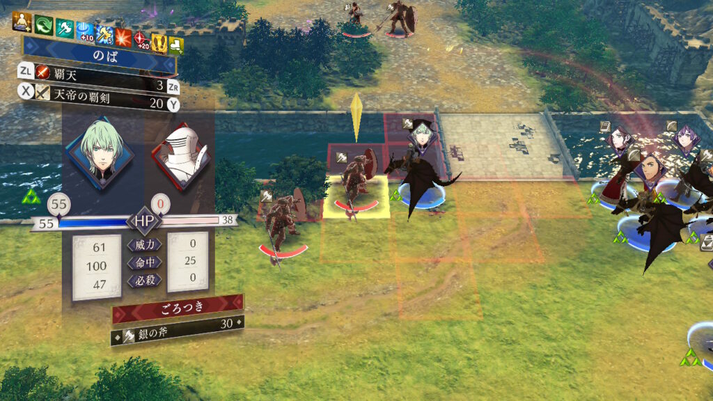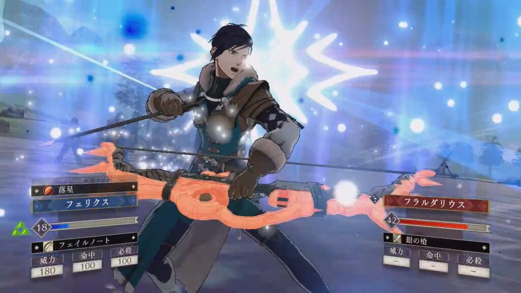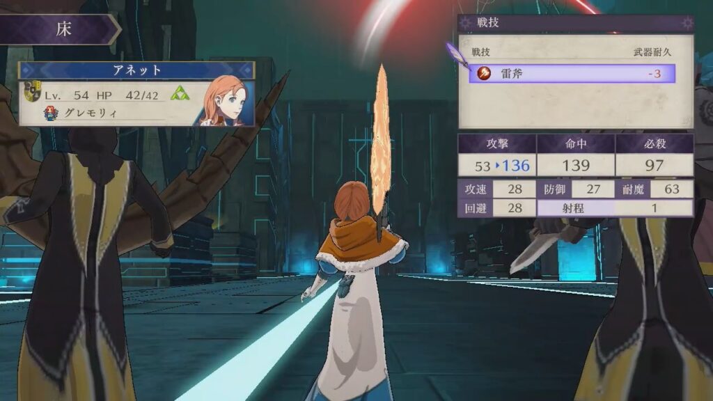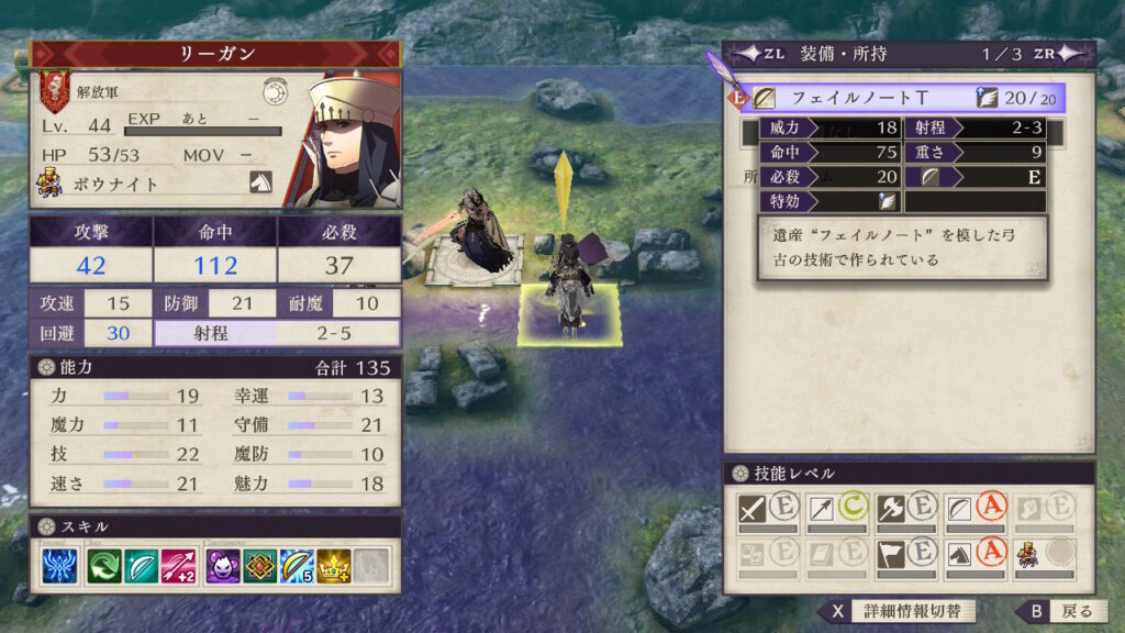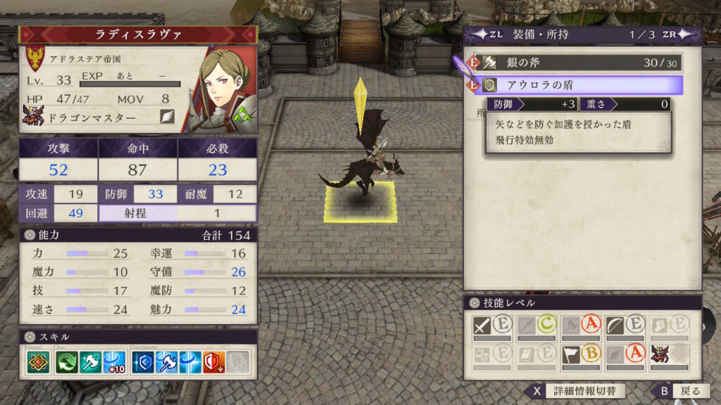 | ラディスラヴァ (飛行) | 防御33 耐魔12 (飛行特効無効) | 敵将ではあるが将星に留まるので、状態異常が有効。アウロラの盾を盗めば飛行特効が狙える。 金鹿の学級編とは違いフェイルノートが手に入らないので、パルティア+強弓を使えるフェリクスを起用。 |