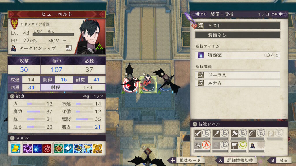 | ヒューベルト | 大将星 防御16 耐魔41 砦(守備・魔防+2) | 帝都アンヴァルの個体。 後述のミュソンと同じく無限の魔法でデスΓ(ガンマ)を無限に使用してくるので、接近とカンストは同時に狙うべきか。 因みに先生ルートや金鹿編と違い、倒すとクリアになる |