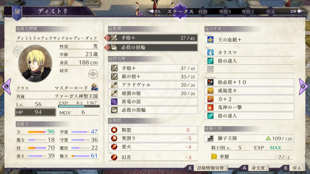 | ディミトリ | 大将星 防御22 耐魔9 回復床(守備・魔防+1) | 大将星を持ってはいるが耐久力はかなり低めで、物理であればウォーマスター+戦鬼の一撃でカンストを出せる。 普通に動いてくれるので回復床は考慮しなくていい |