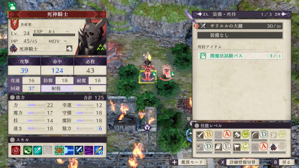 | 死神騎士 (騎馬) | 大将星 防御30 耐魔22 砦(守備・魔防+2) | 帝都アンヴァルの個体。 死神騎士との対決はこれで最後になる。 ステータスが上がっており、且つ砦に位置し動かないという点も注意 |