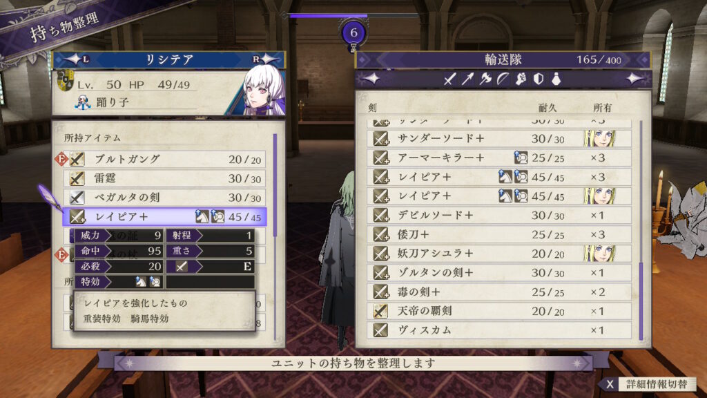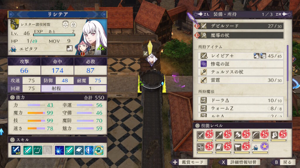 「魔防の応援」や使うことが全くと言っていいほどなかった「明鏡の一撃」、エピタフの兵種補正、「神祖の加護」という外部商法コンテンツなどを見つけて、魔防の3割(小数点以下切り捨て)を戦技威力に加算することでようやく光が見えてきて、リシテアちゃんのレベリングも捗る。