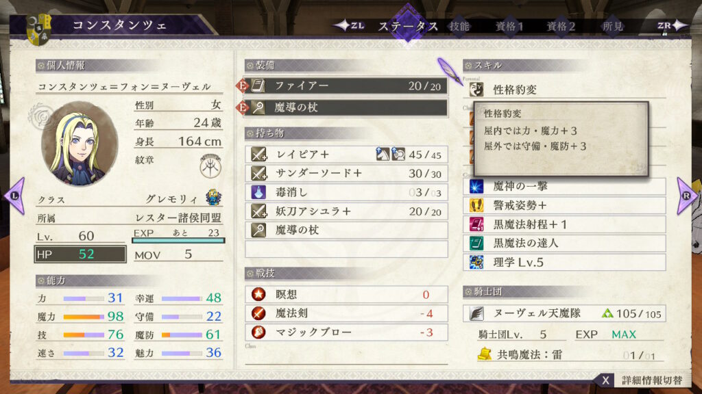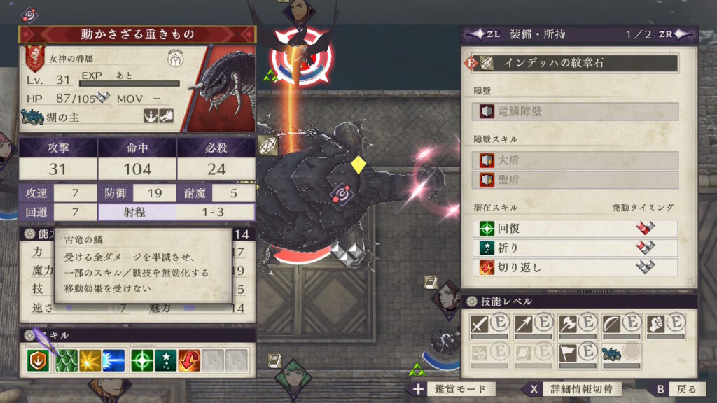 | フェルディナント (騎馬) | 防御28 耐魔11 | 防御が高めだがカンストが狙えない域ではなく、耐魔に関しては金鹿の学級編最終戦のフォドラ十傑程度のものなので、物理・魔法のどちらでもカンストは狙える。 但し、ラディスラヴァを倒すかフェルディナントとの戦闘が始まると同じエリアに増援として入って来るローレンツら同盟軍の存在が位置取りの難易度を上げる |