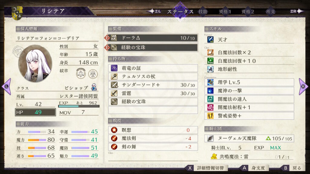 ・兵種:エピタフ(補正で魔力+2、魔防+2。剣の達人持ち)