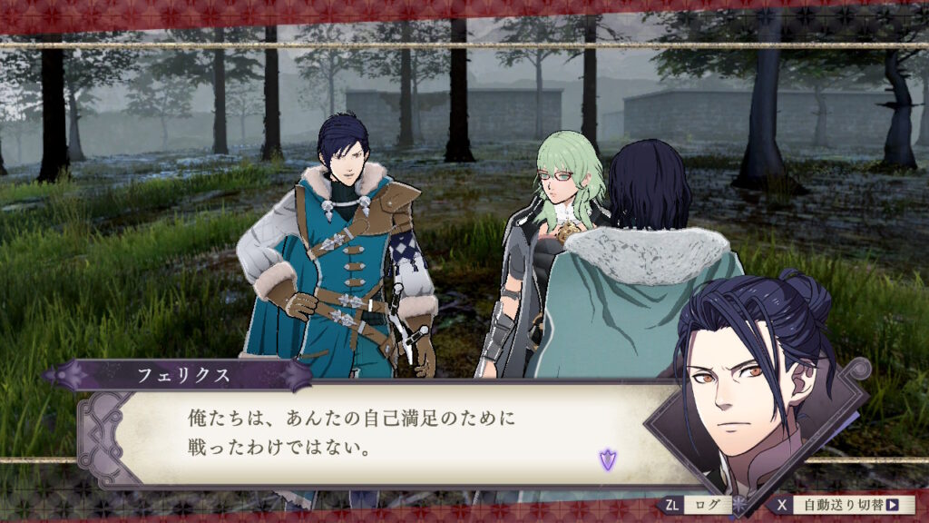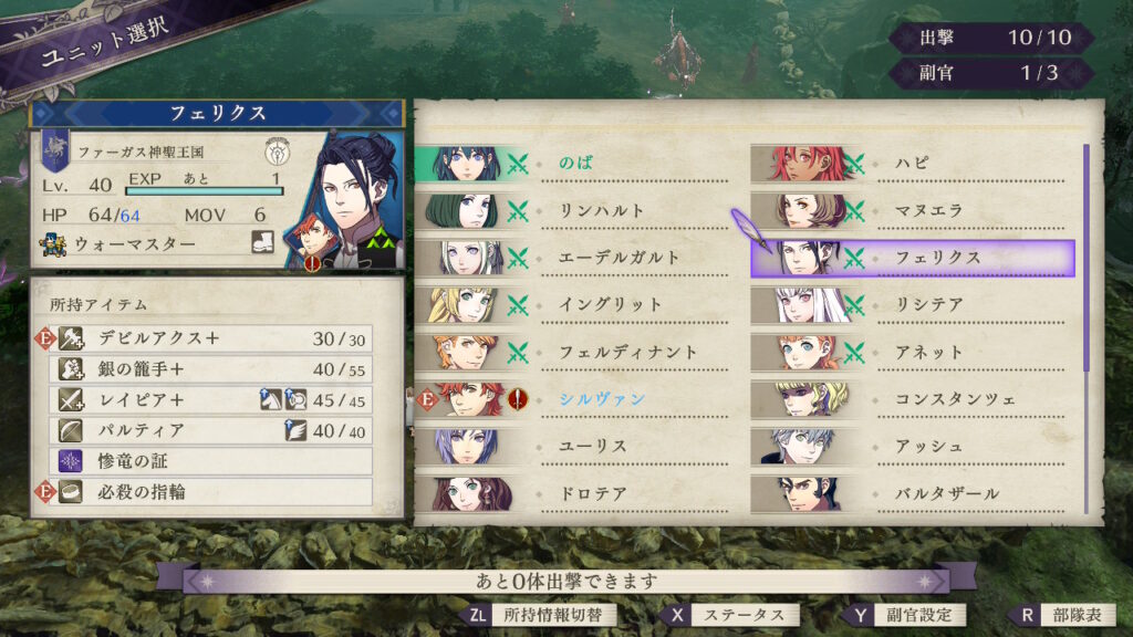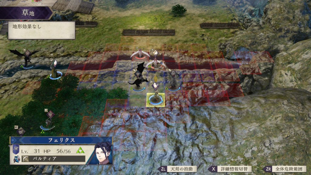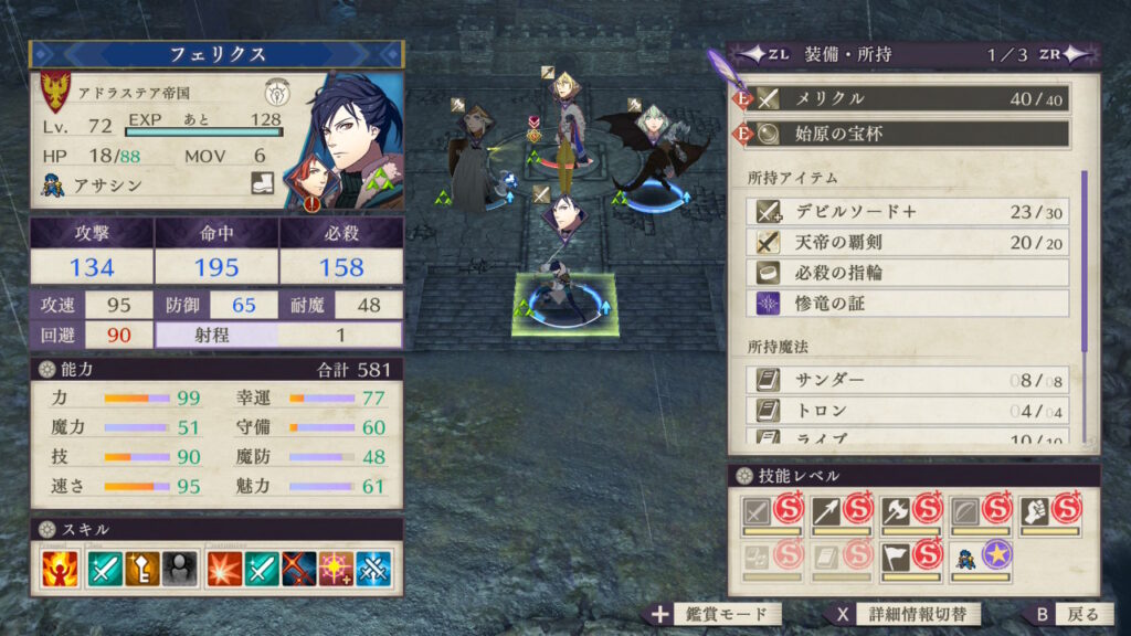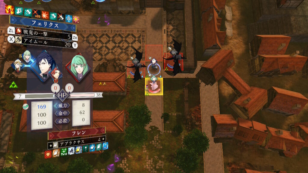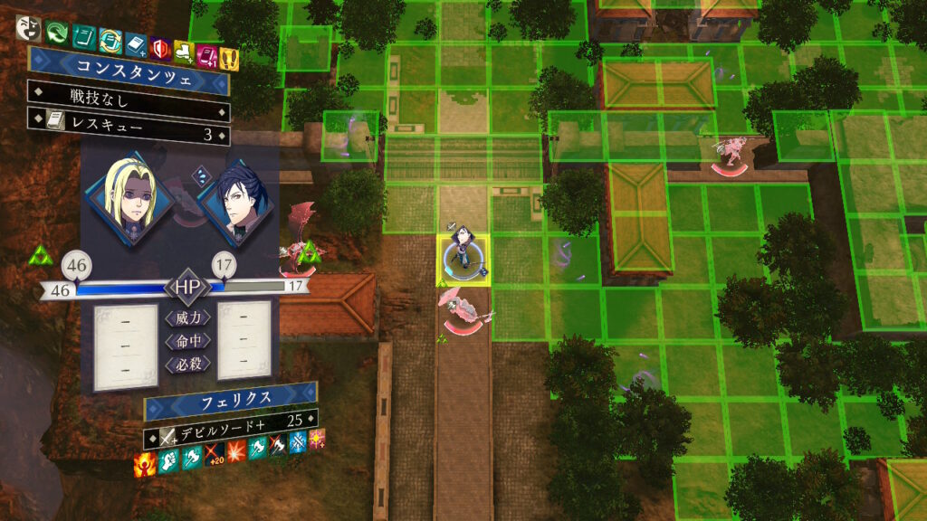 その他のグループはレア(セイロス)が増援出現するエリアに集合して雑兵を処理しておき、フェリクスのHPが覚醒スキル発動圏内まで減少したら、コンスタンツェのレスキューで回収、バフをかけディミトリにぶつける。