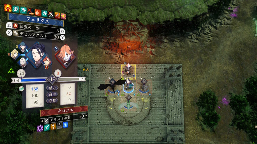 調整方法として、フェリクスに始原の宝杯を持たせてデビルソードを装備し上部にワープで飛ばし、左上に向かって単身進軍しつつ雑兵を倒していくことでHPを削っていく。