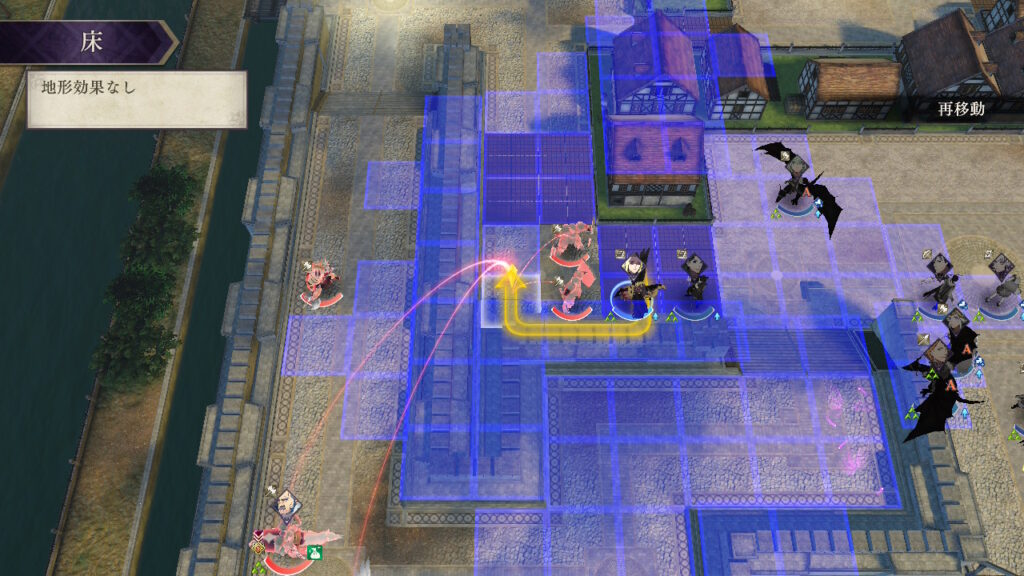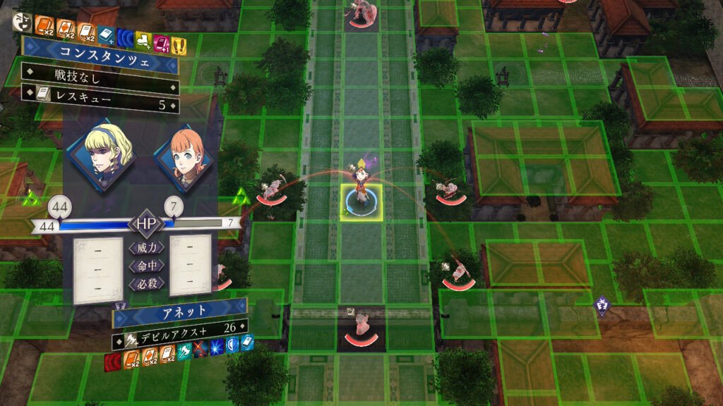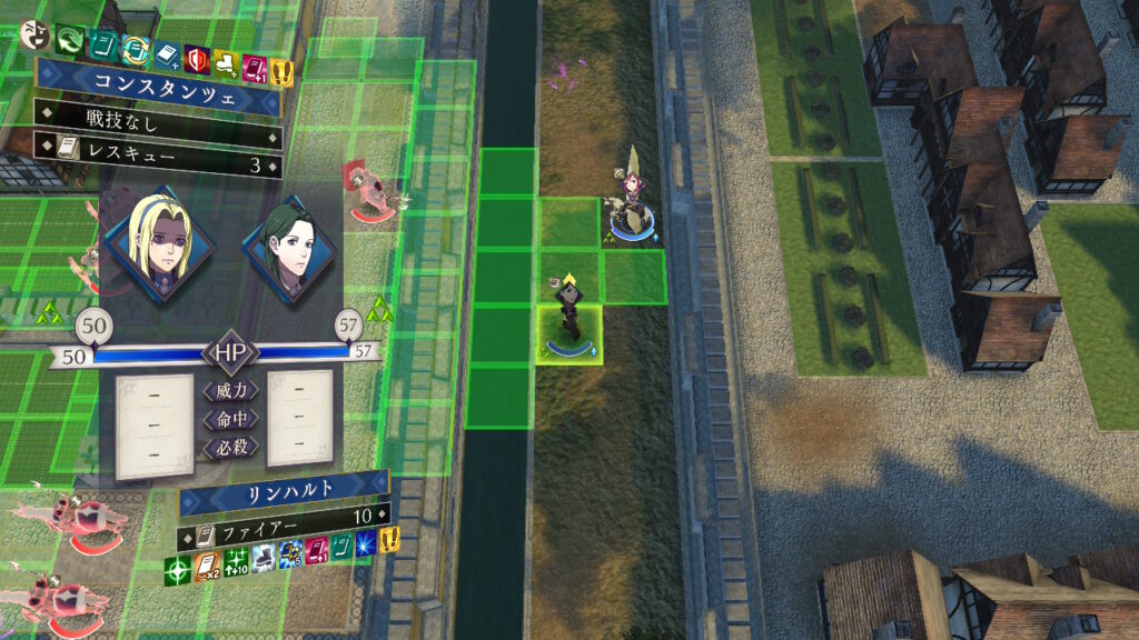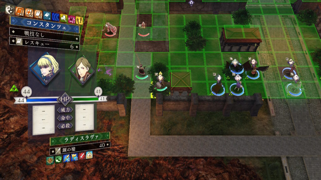 放置していると布陣を整えている間にギルベルトの方へ向かっていき、ギルベルトの眼前で布陣を構築できなくなってしまうので、このラディスラヴァをコンスタンツェのレスキュー、そしてワープ要員を使って右端へ飛ばす。