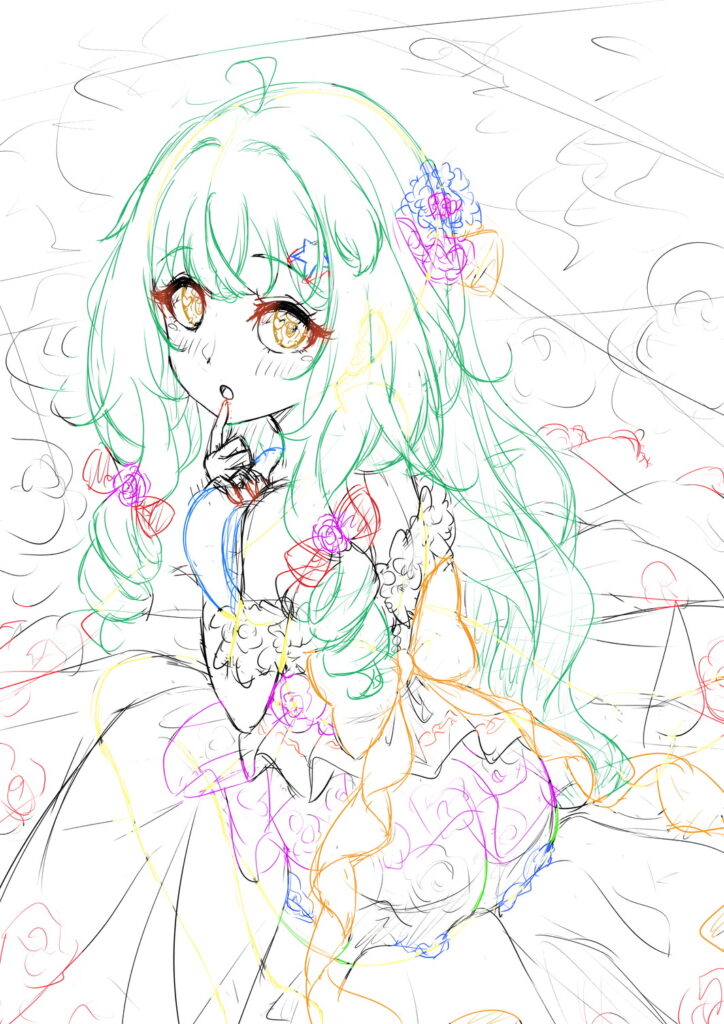お姫様のドレスを服装にしたので完成イラストでは足部分の仕草は見えていないが、上述の下書きの通り女の子座りになっている。