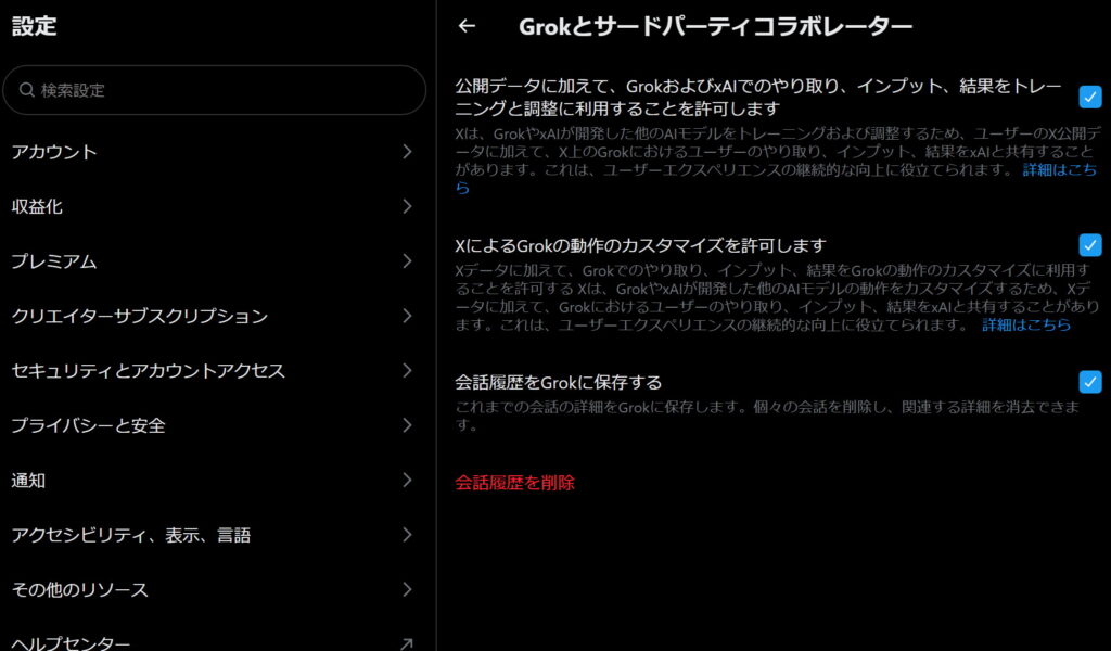 因みに、「設定→プライバシーと安全→データ共有とカスタマイズ→Grokとサードパーティコラボレーター」画面でGrokに関するチェックを全て外しても画像修正機能は防止できない。
